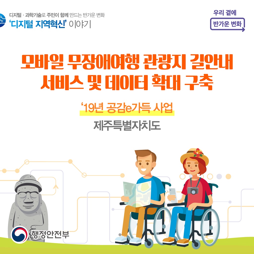 2019년 행정안전부, 공감e가득 사업으로 선정되어 지원받은 모바일 무장애 여행 관광지 길안해 서비스 및 데이터 확대구축 사업을 소개해 드립니다.※ 출처: 행정안전부, 우리 곁에 반가운 변화(https://happychange.kr/)
