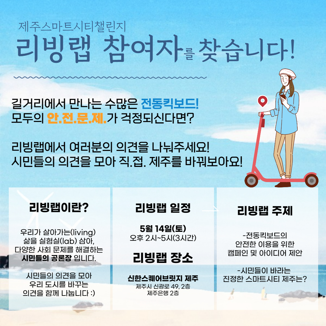 [주식회사 제주스퀘어] 제주 스마트시티 챌린지 리빙랩 참여자 모집 안내입니다. 1. 리빙랩이란?우리가 살아가는(living) 삶을 실험실(lab) 삼아, 다양한 사회 문제를 해결하려는 시민들의 공론장입니다.2. 리빙랩 일정/장소일정 : 5월 14일 토요일 오후 2~5시장소 : 신한스퀘어브릿지 제주(제주시 신광로 49, 제주은행 2층)3. 리빙랩 주제-전동킥보드의 안전한 이용을 위한 콘텐츠 제작/캠페인 아이디어 제안-제주스마트시티챌린지 및 스마트허브에 관한 설명-시민들이 바라는 진정한 스마트시티 제주는?4. 리빙랩 활동 혜택- 소정의 상품권(이마트상품권 3만원권) 지급- 리빙랩 종료 후 스스로해결단(제주특별자치도 디지털사회혁신플랫폼) 활동증명서 증정5. 신청은 https://forms.gle/TtVZ7YMWjkEKaGLr6링크에서!? |