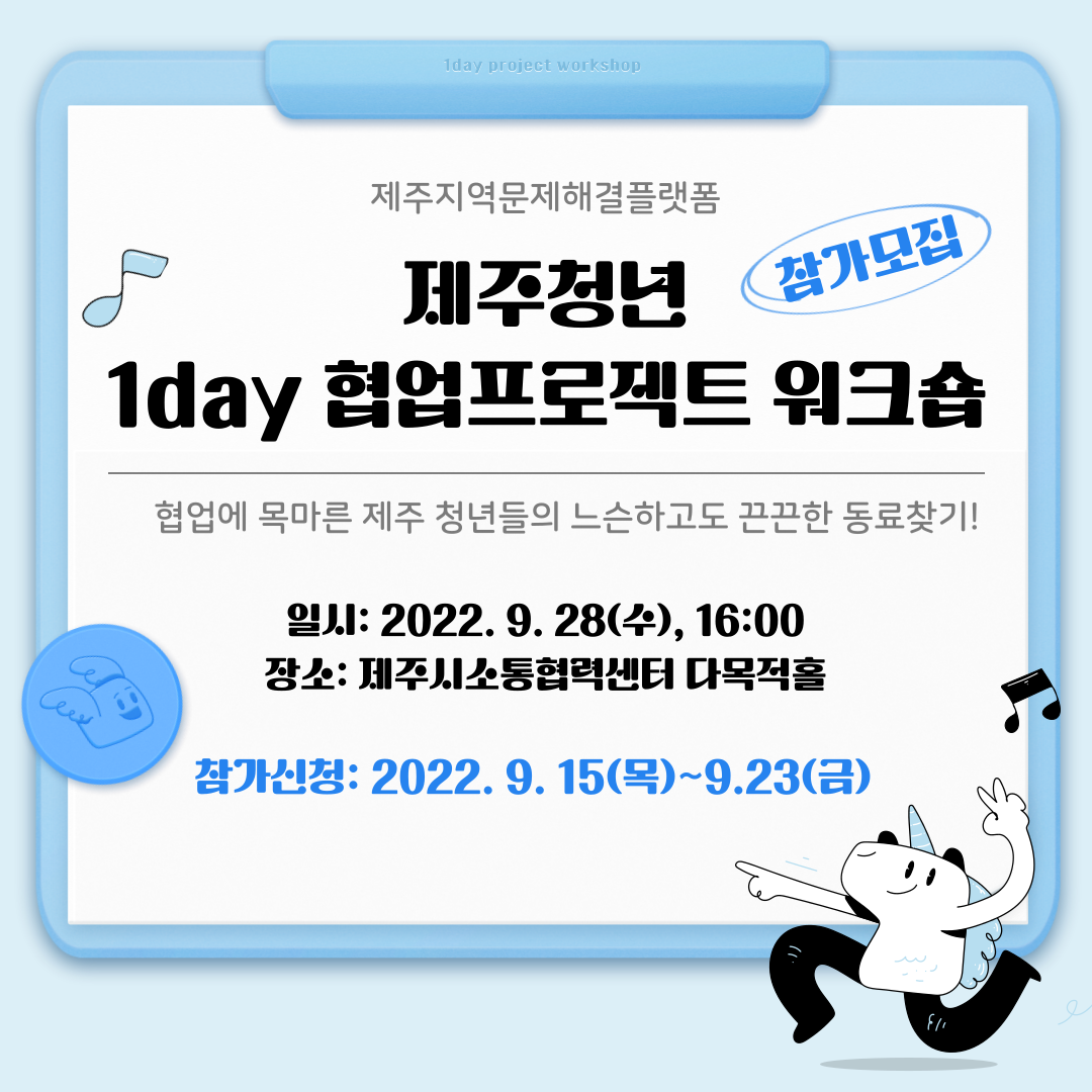 한번의 만남이 끝이 아닌 그 다음을 함께 이야기할 수 있는느슨하고도 끈끈한 동료 찾기,<제주청년 1day 협업 프로젝트 워크숍>에여러분을 초대합니다!