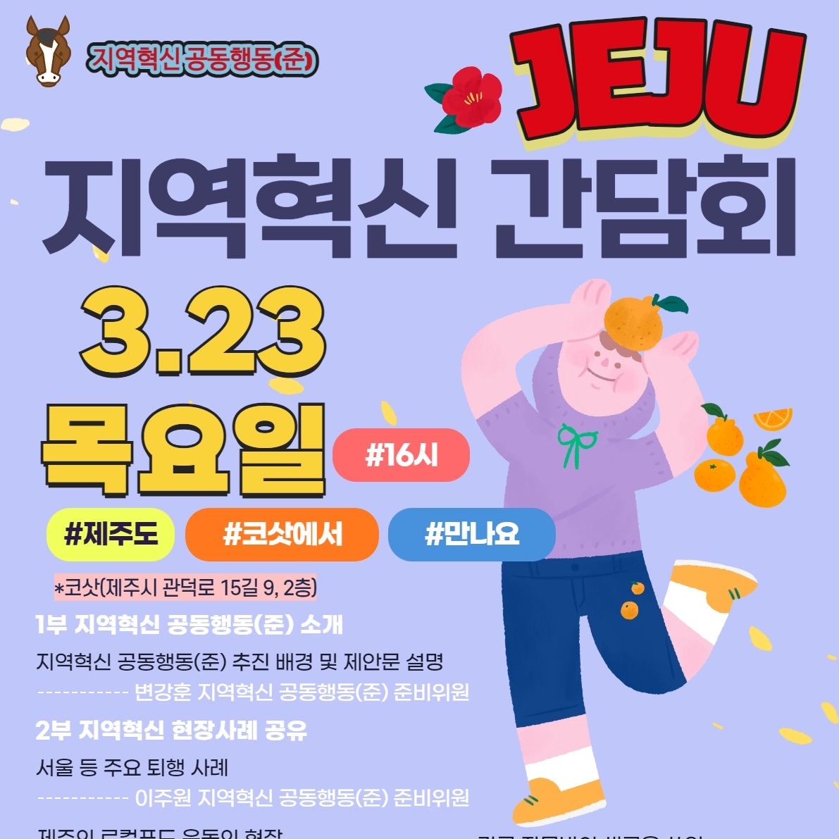 제주도에서 이루어지고 있는 여러가지 지역혁신의 이야기를 함께 들어보면 어떨까 합니다. 다양한 꿈을 가지고 현장에서 시도와 노력을 하고 계신 분들을 모셨습니다.